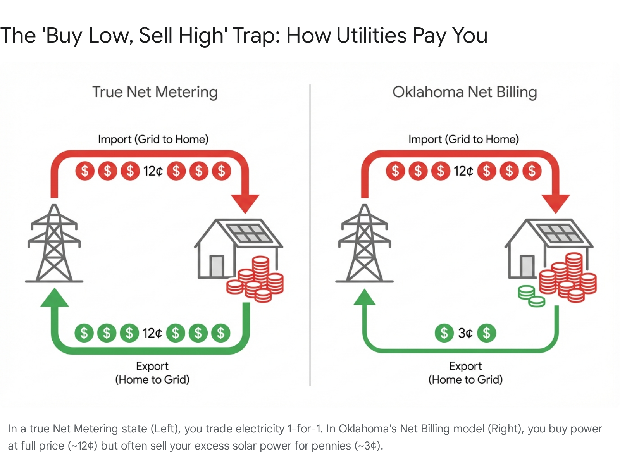 Oklahoma state law mandates that utilities offer net metering, but it does not mandate the price they must pay you for your power.8 This creates a massive loophole that utilities have used to shift from "Net Metering" to "Net Billing."